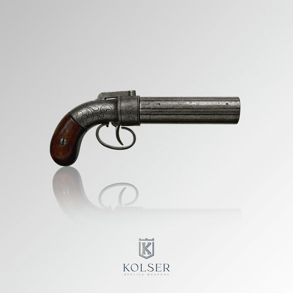 The Pepperbox pistol was a widely used defensive solution in the first half of the 19th century because it offered multiple shots without the need for immediate reloading. Between 1837 and 1847, very few units were documented (according to historical sources, only six units of certain models), which increases its historical value and uniqueness. Kolser’s replica recovers that aura: visual weight, presence, and a finish that stands out in any display case.