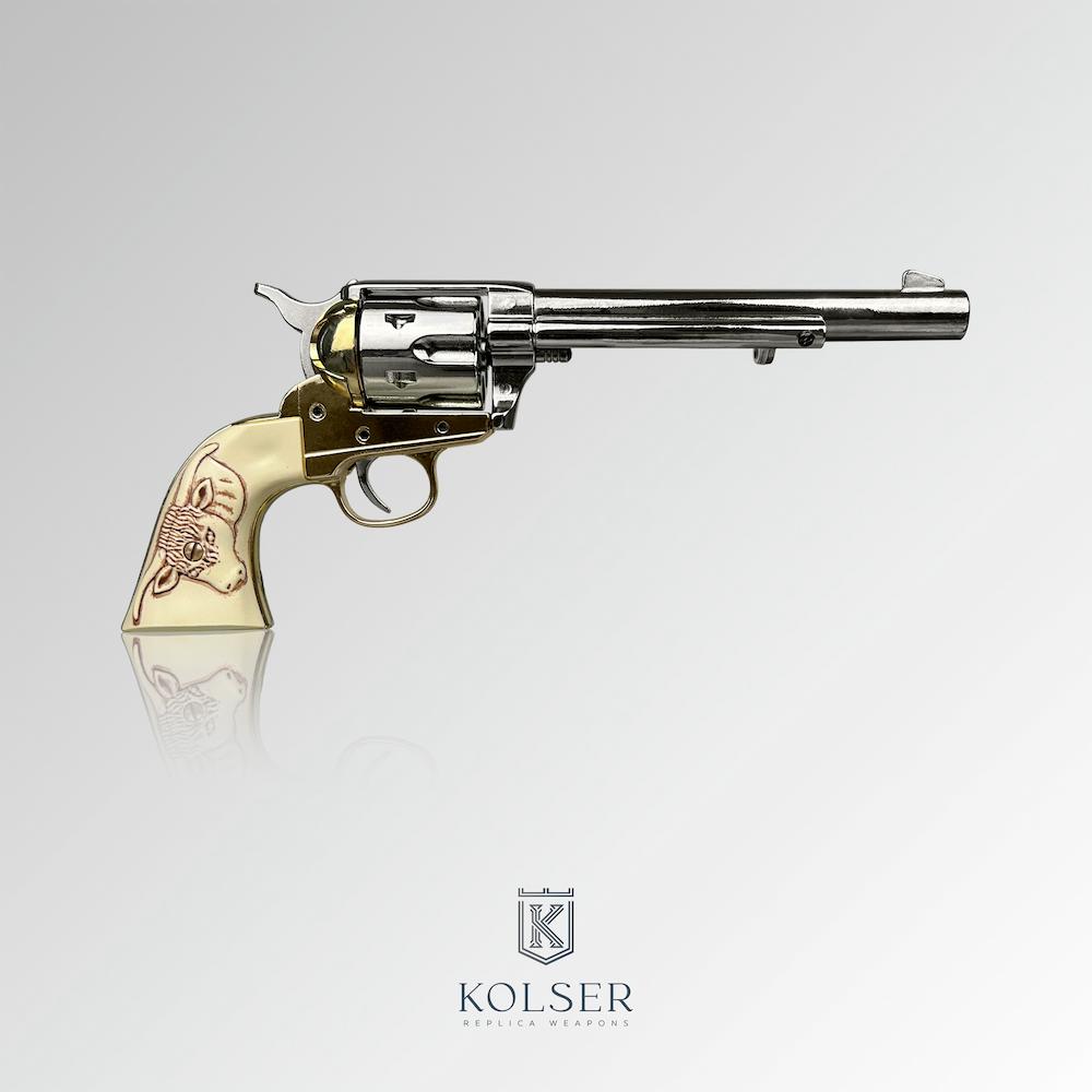 La réplica de Kolser respeta el diseño original adaptándolo a su función de non-firing réplica. Con 31 cm de longitud, emula la presencia imponente del auténtico Colt 45. Los acabados varían desde el metal envejecido y acerado hasta combinaciones de latón y níquel.
